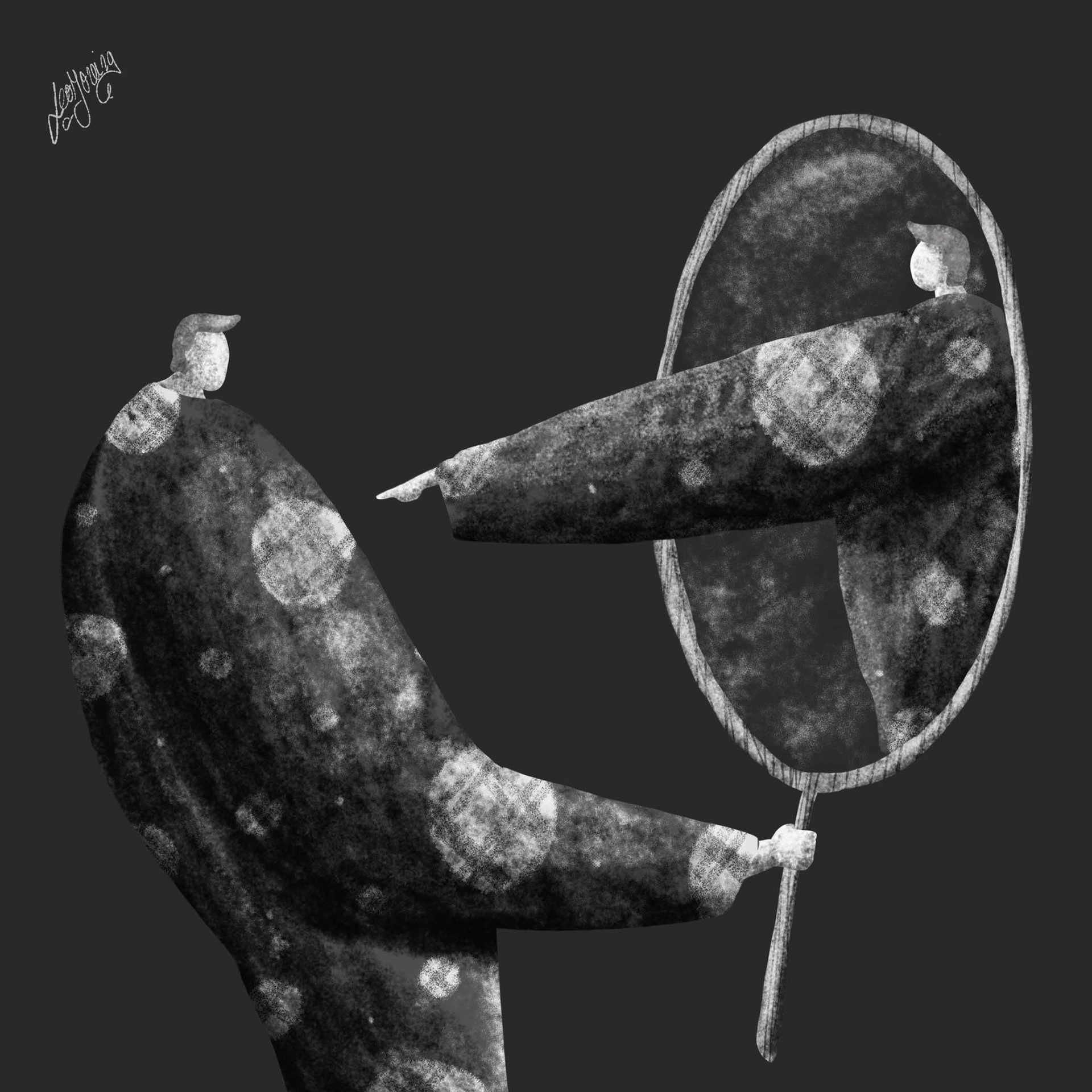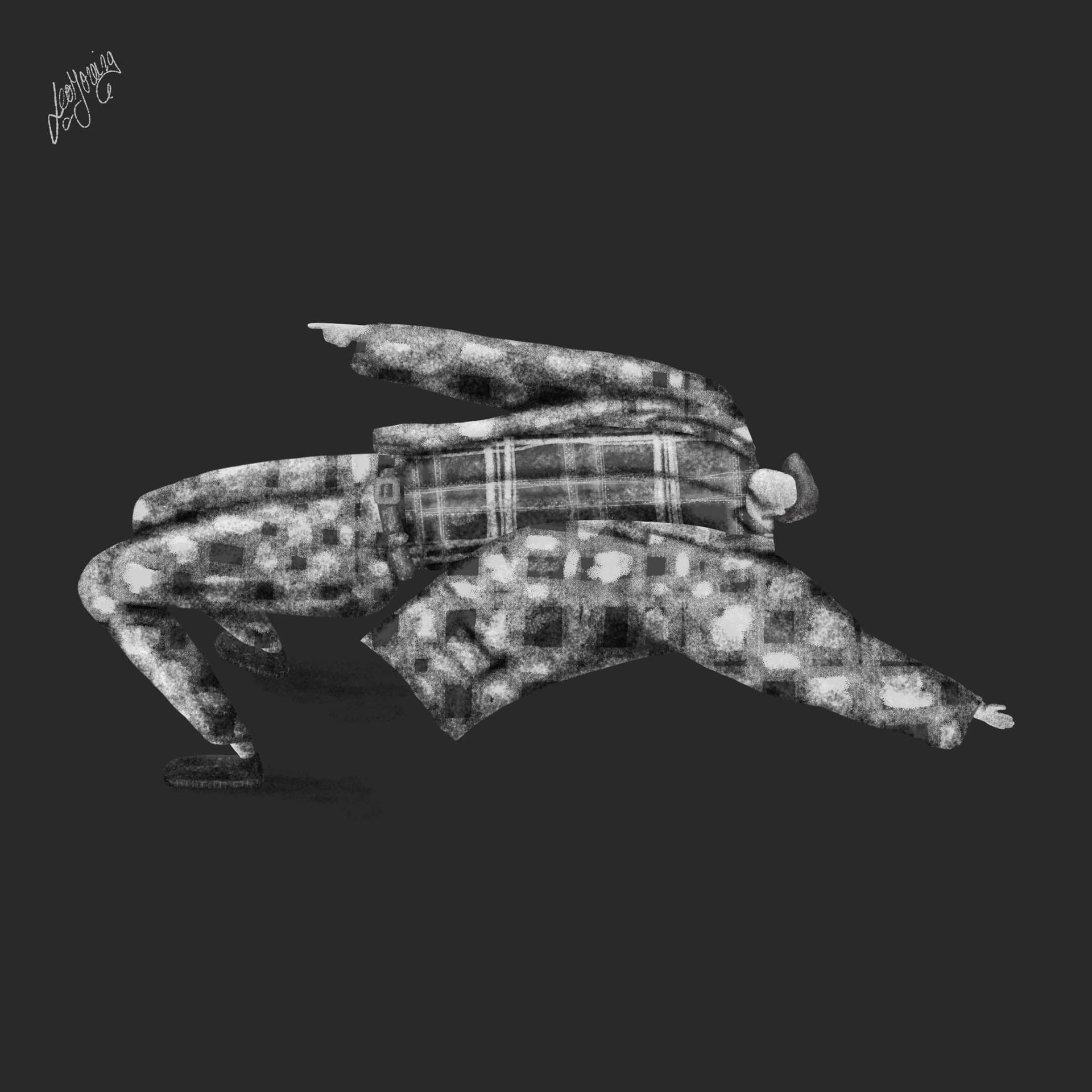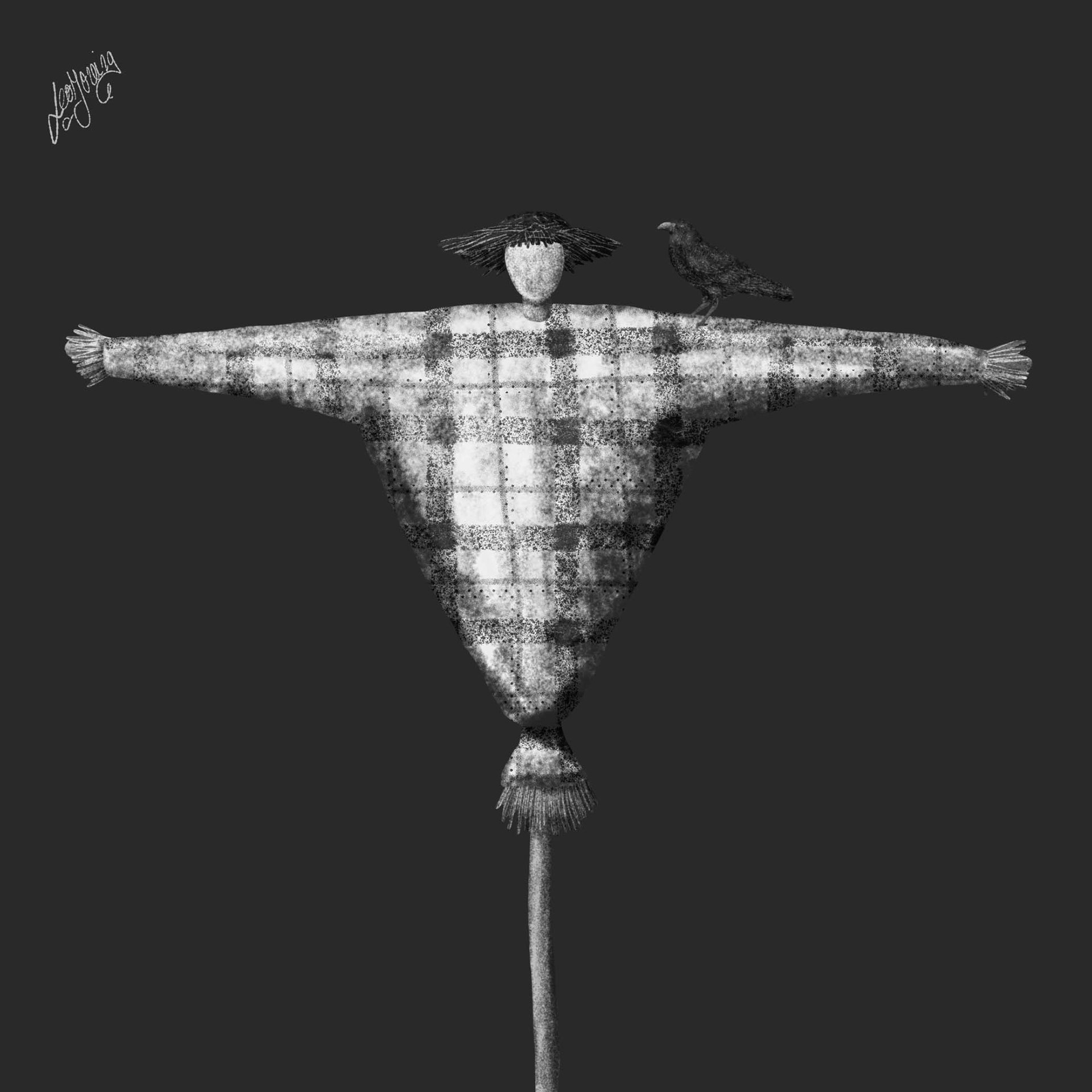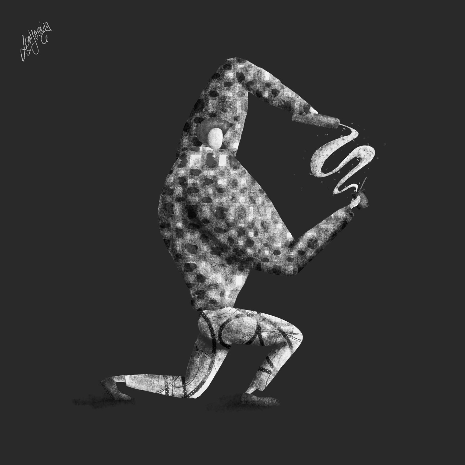 Serie de ilustraciones y personajes desarrollados en blanco y negro.